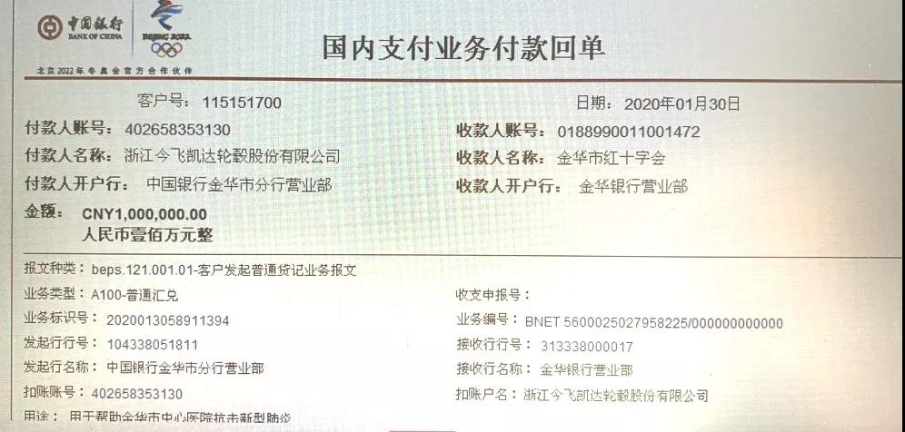 疫情牵动人心,行动彰显担当!2020年1月30日,在全国上下共同防控抗击新型冠状病毒疫情关键之际,浙江今飞凯达轮毂股份有限公司向金华市红十字会捐款人民币100万元,用于疫情的防控和感染人员的救治。