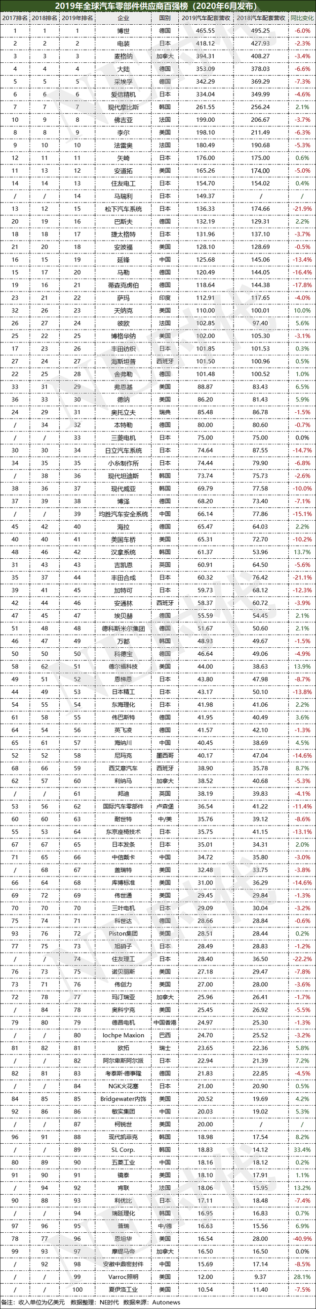 近期,专业汽车网站Autonews发布了2019年汽车零部件企业全球百强榜,从榜单上来看,全球汽车零部件头部企业变化不大。与过去一样,博世、电装、麦格纳、大陆和采埃孚仍然是世界上最大的五家汽车零部件供应商。中国企业发挥稳定,延锋、均胜汽车安全系统、海纳川、耐世特、中信戴卡、德昌电机、敏实集团、五菱工业、普瑞、安徽中鼎密封件均榜上有名。其中,中信戴卡居66位。
