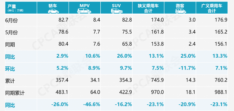 7月8日,乘联会发布了6月全国乘用车产销数据。数据显示,狭义乘用车6月产量为174万台,同比上升13.1%,环比增长7.5%。上半年累计产量为745.9万台,同比下滑23.1%。