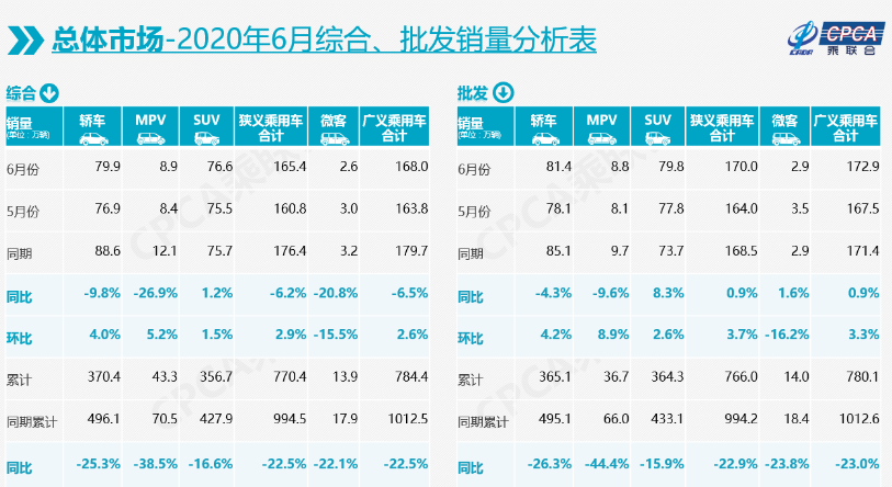 6月乘用车综合、批发销量(图表来源:乘联会)