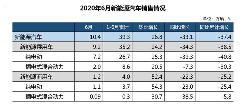 20206月,我国新能源汽车产销分别完成10.2万辆和10.4万辆,环比增长21.3%26.8%,同比下降25.0%33.1%