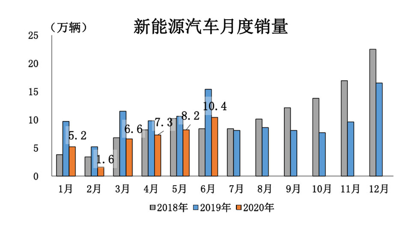 3月份开始,我国新能源汽车产销呈现恢复性增长态势,6月新能源汽车保持环比上升的态势,同比依旧下降。
