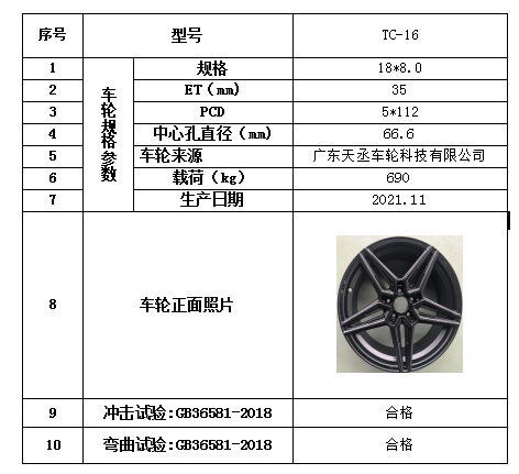 第三,车轮采购客户,在采购车轮时候一定要仔细查验车轮永久标识,特别是制造商品牌、规格、偏距、载荷、生产日期共计5项车轮特征参数。同时要求经销商出具符合国家强制标准GB36581-2018 《汽车车轮安全性能要求及试验方法》的第三方检测报告。