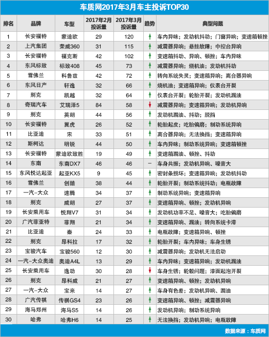 受3.15因素影响,3月份消费者的投诉意愿较强且投诉较为集中。本月投诉量在进入2017年后首次突破4000宗,部分车型投诉较为集中,排行榜前三位的车系投诉总量均超过百宗。其中,长安福特的蒙迪欧和福克斯分列第一和第三名,投诉量环比涨幅分别为3.1倍和1.4倍,厂家应该进一步给予重视。值得一提的是,在TOP30榜单中仅有2款车型投诉量环比实现下降,分别为奇瑞艾瑞泽5和长安逸动。特别是奇瑞艾瑞泽5,由于厂家对投诉问题非常重视且处理及时得当,因此艾瑞泽5在3月份的投诉量环比下降31%,排名也由上个月的第一名下降到第八名。