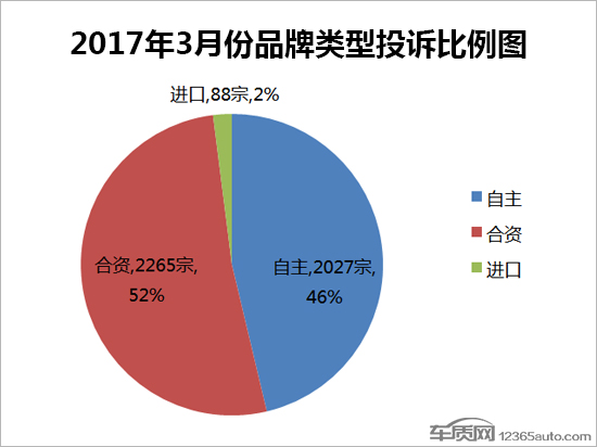 3月,合资品牌的投诉量自2016年11月以来首次超过自主品牌,且占比超过50%,投诉量达2265宗,环比大幅上涨52.5%。同期,自主品牌及进口品牌在投诉量方面,环比均有不同幅度的上涨。其中自主品牌投诉量为2027宗,环比增加313宗,占比下降8个百分点%;进口品牌投诉量为88宗,环比增加25宗,占比保持不变。