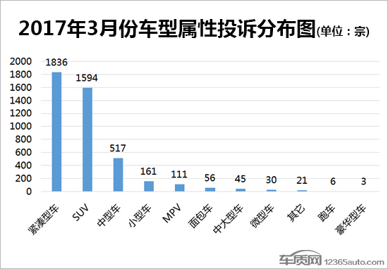 如上图所示,3月份2015款和2016款车型依旧为投诉的主体,两者投诉之和达2427宗,占投诉量的55.4%。另外,2012款车型和2017款车型的投诉量环比增幅较为明显,投诉量环比分别上涨55.4%和38.2%,投诉问题主要集中在发动机异响和变速箱异响、顿挫等问题上。