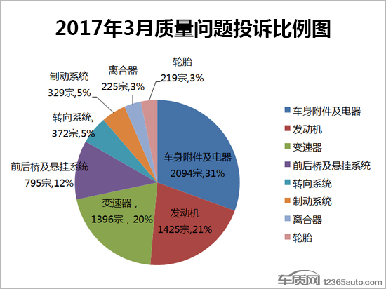 在3月份接到的质量投诉中,车身附件及电器部分故障问题依旧最为集中,投诉量较2月增加了635宗,环比上涨43.5%。此外,其余质量问题的投诉量环比也均有不同程度的涨幅。其中,离合器、轮胎和变速器问题的投诉量涨幅明显,环比分别上涨64.2%、46%和40.6%,可见,这三类问题已成为3月份的投诉重点,且有上升趋势。