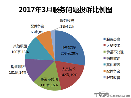 3月,在涉及服务问题投诉中(包含综合问题),“服务态度”投诉量为208宗,较2月上涨19.5%,但占比却下降了3个百分点。而“承诺不兑现”问题在3月份再次成为了服务投诉的重点之一,具体表现为“提不到车”和“销售承诺不兑现”。在服务问题投诉中,合资品牌“服务态度”问题较为突出,而自主品牌则在“人员技术”及“承诺不兑现”问题方面超过合资品牌。
