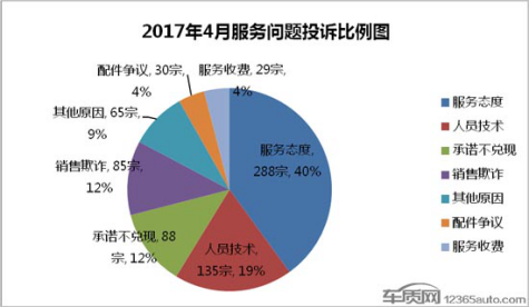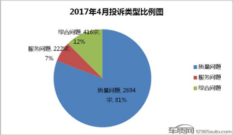 目前,车质网接到的投诉主要分为质量问题、服务问题及综合问题三大类。4月份,这三类问题的投诉量均有不同程度的降低。其中,质量问题投诉量较3月减少了1027宗,下降趋势明显,占比下降4个百分点至81%。同期,综合问题投诉量环比增加17宗,较3月上涨了4%。