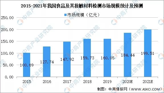 食品安全与人民群众的生活息息相关,其质量安全检测达标与否,直接影响到群众的生命健康。据国家市场监督管理总局统计,我国食品及食品接触领域检验检测行业市场规模从2015年的100.69亿元增长至2019年的160.05亿元,年均复合增长率达12.28%。