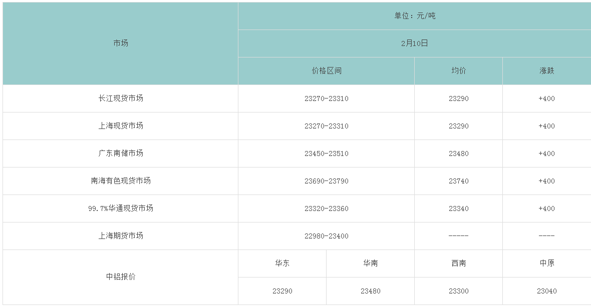 2月10日各大市场铝锭价格表