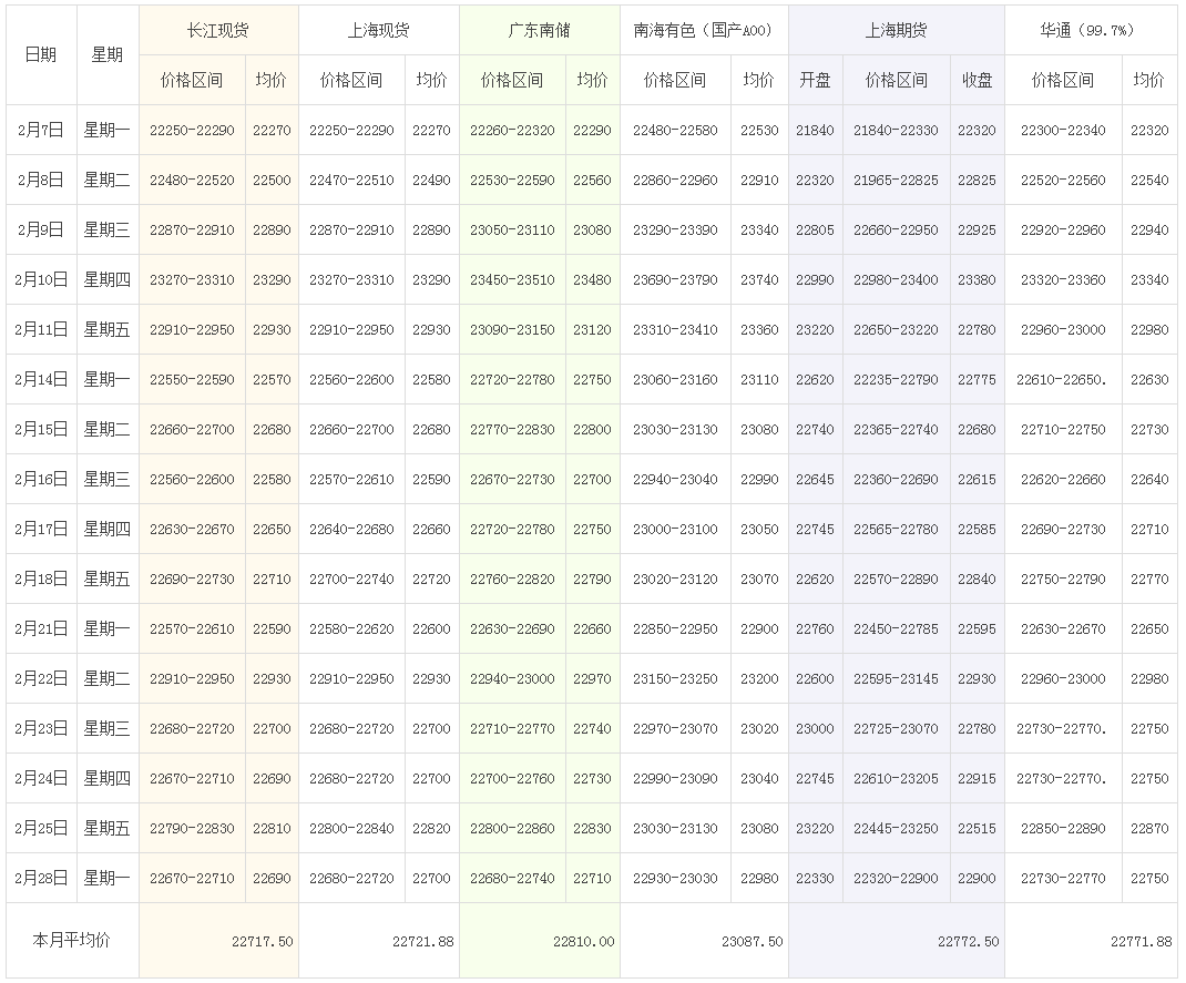 2022年2月各大市场铝锭价格表