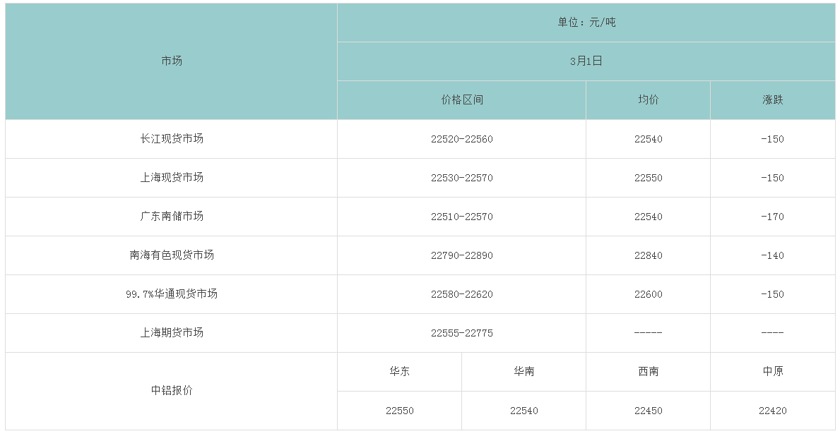 3月1日各大市场铝锭价格表