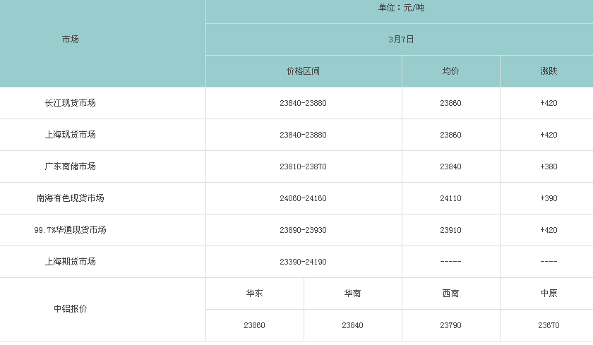 3月7日各大市场铝锭价格表