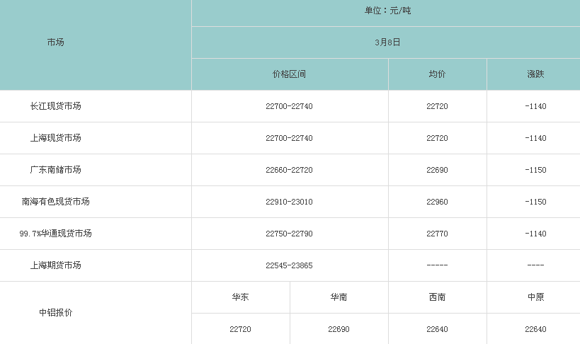3月8日各大市场铝锭价格表
