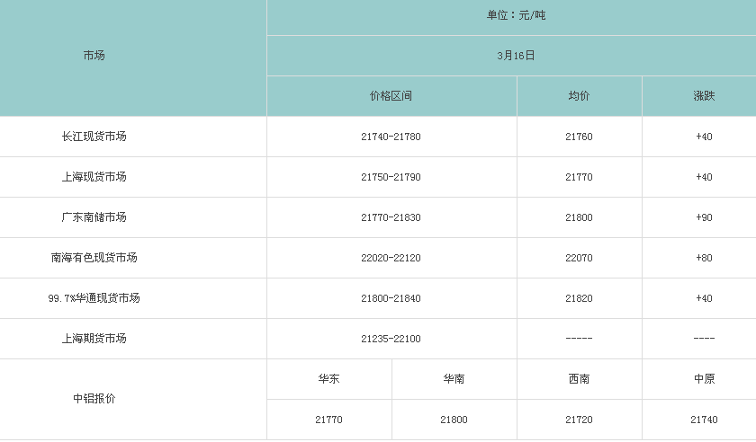 3月16日各大市场铝锭价格表