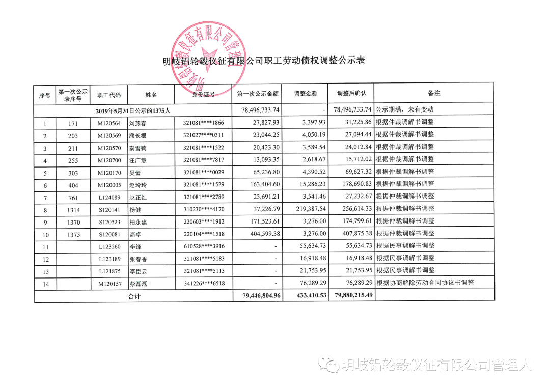 附件:明岐铝轮毂仪征有限公司职工劳动债权调整公示表
