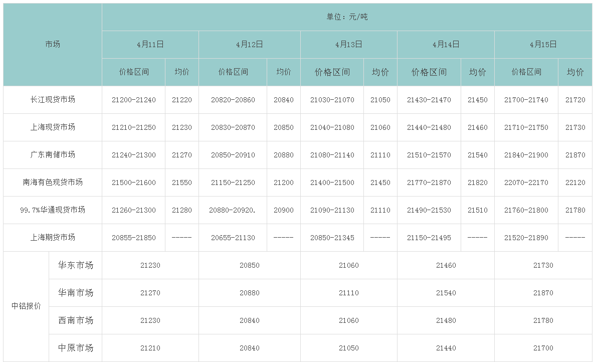 4月11日~4月15日各大市场近五个交易日铝锭价格表