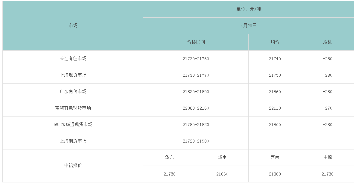 4月20日各大市场铝锭价格表