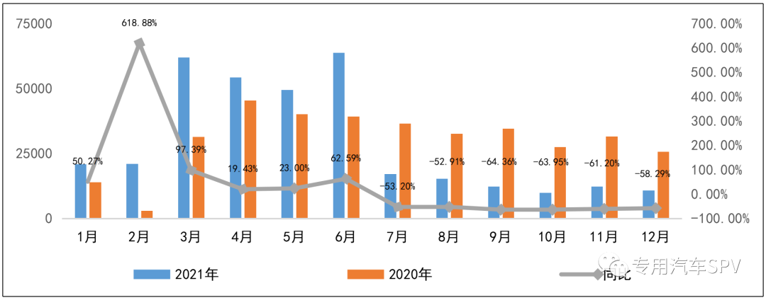 受疫情及政府投资力度减缓等影响,2021年自卸汽车市场呈现冰火两重天的现状,上半年同比增长超50%,下半年同比下降近60%。