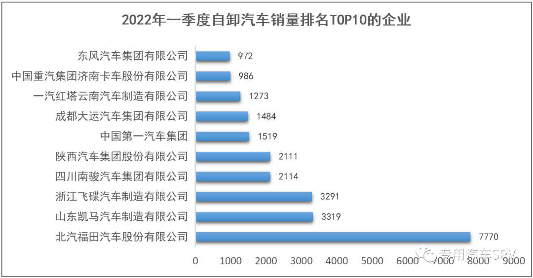 2022年一季度自卸汽车细分行业市场表现 从销售企业来看,2022年一季度自卸汽车产生销量的企业有64家,分布于全国21个省市和自治区,主要集中在湖北、山东、四川、安徽、北京等省市,这五个省市企业达到36家,占比56.25%。湖北省为自卸汽车生产企业最多的省份,有13家企业生产并销售自卸汽车。 2022年一季度销量过千的企业有8家,合计销售22881辆,占一季度总销量的64.85%。自卸汽车头部企业北汽福田汽车股份有限公司,一季度销售7770辆,是唯一一家销售超5000辆的企业。2022年一季度自卸汽车有57个品牌,排名前五的品牌为福田、凯马、飞碟、解放、东风,销量均超2000辆。