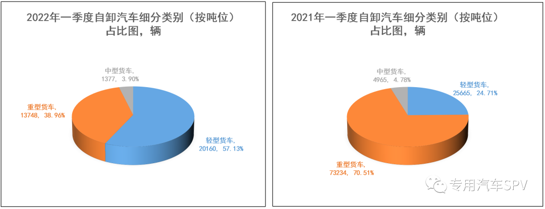 按吨位来分,自卸汽车分为轻型、中型、重型三大类。2022年一季度自卸汽车主要以轻型车为主,占比57.13%,与2021年同期占比提升32.42个百分点。其次是重型车,2022年一季度占比38.96%,较2021年同期占比下降31.55个百分点。中型车占比几乎持平。