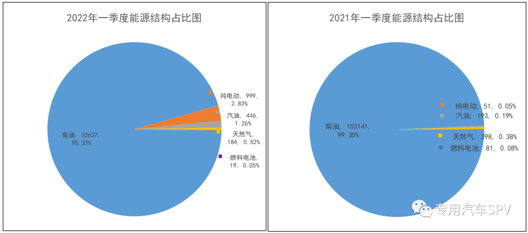 从产品能源结构来看,有柴油、纯电动、汽油、天然气、燃料电池5种燃料。目前来看自卸汽车的动力能源主要是柴油,2022年一季度占比95.33%,较2021年一季度占比的99.30%下降近4个百分点。值得关注的是,纯电动自卸汽车占比由2021年一季度的0.05%上升到2022年一季度的2.83%,销量由51辆迅速增长到近千辆,同比增长1858.82%。