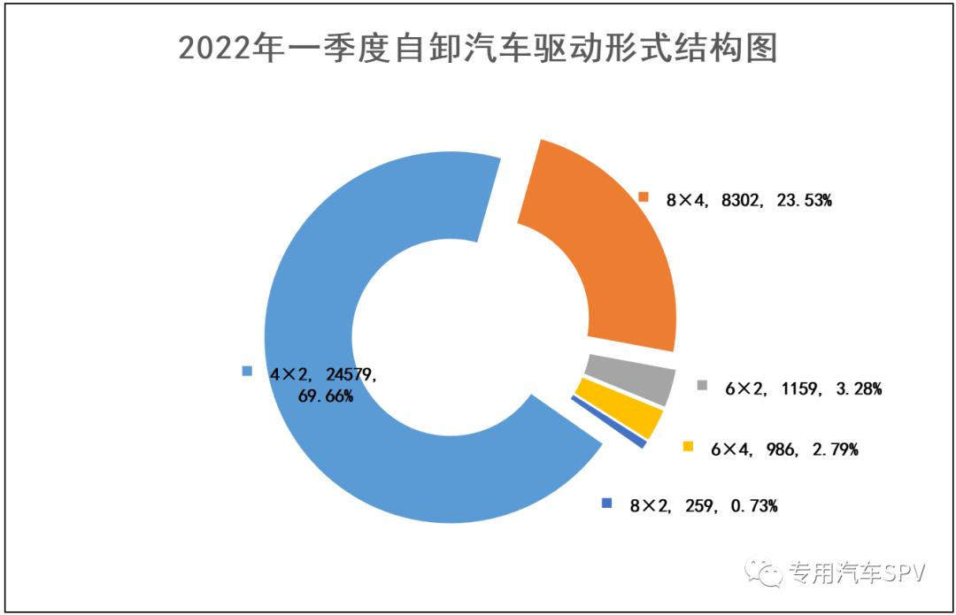 从驱动形式来看,2022年一季度自卸汽车驱动形式主要为4X2的模式,占比近70%,其次是8X4驱动模式,占比23.53%。