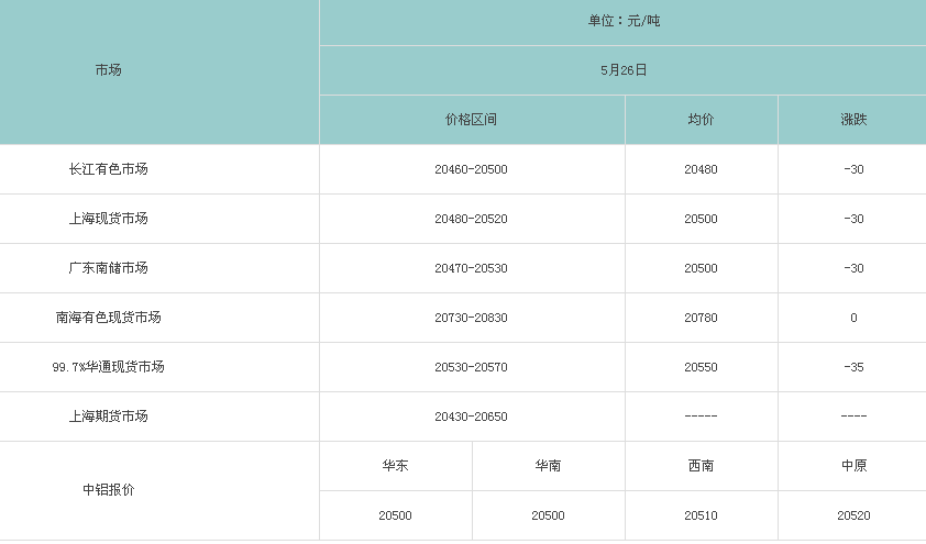 5月26日各大市场铝锭价格表