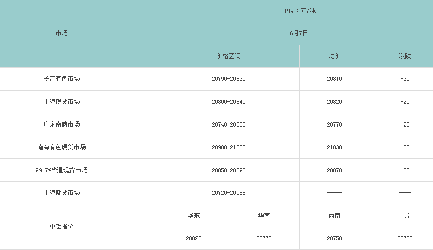 6月7日各大市场铝锭价格表