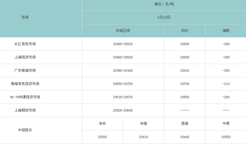 6月10日各大市场铝锭价格表
