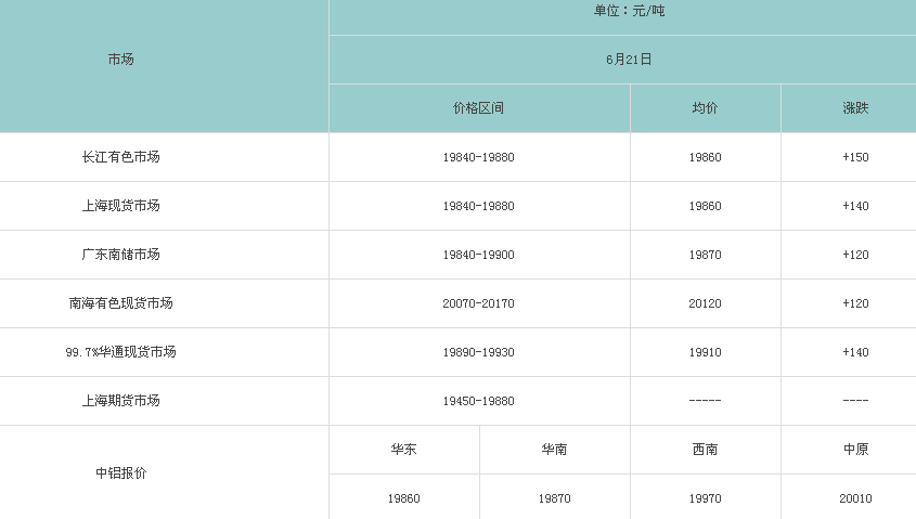 6月21日各大市场铝锭价格表