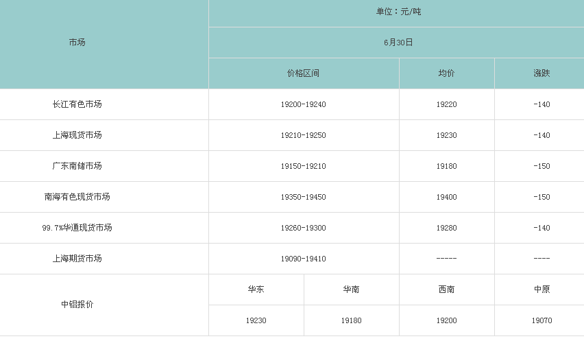 6月30日各大市场铝锭价格表