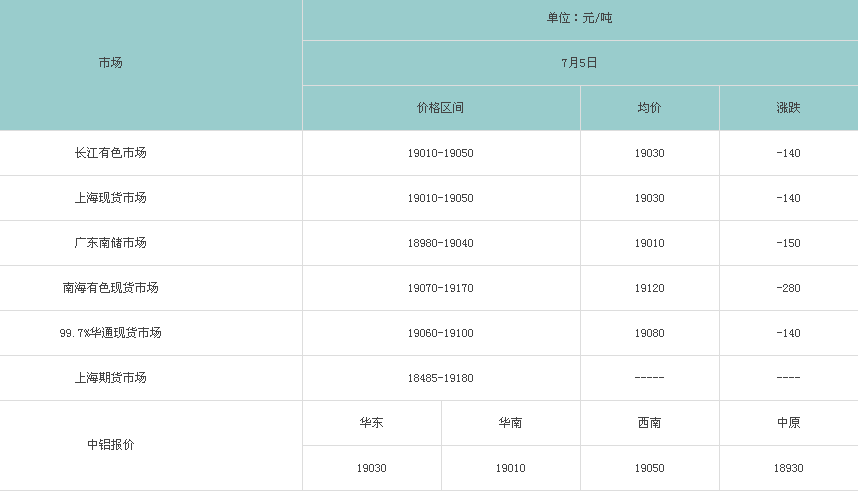 7月5日各大市场铝锭价格表
