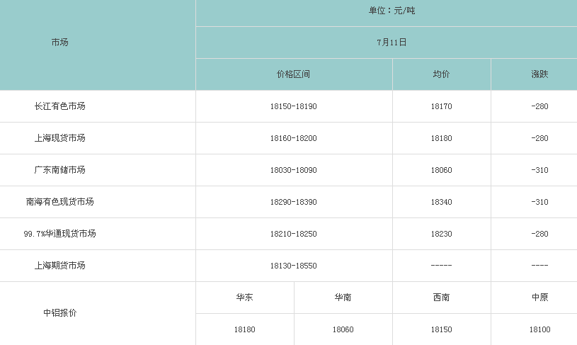 7月11日各大市场铝锭价格表
