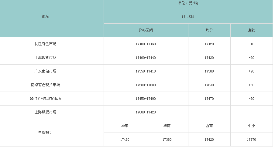 7月15日各大市场铝锭价格表