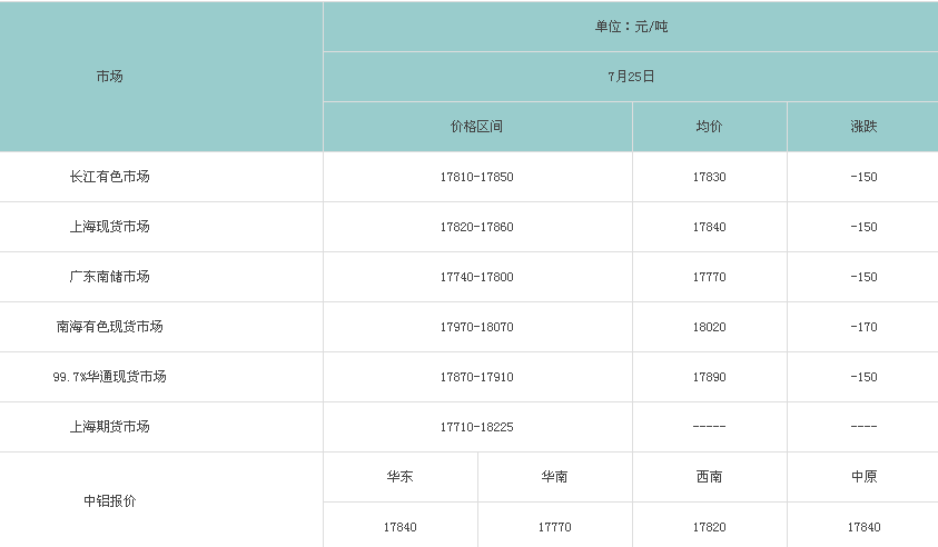 7月25日各大市场铝锭价格表
