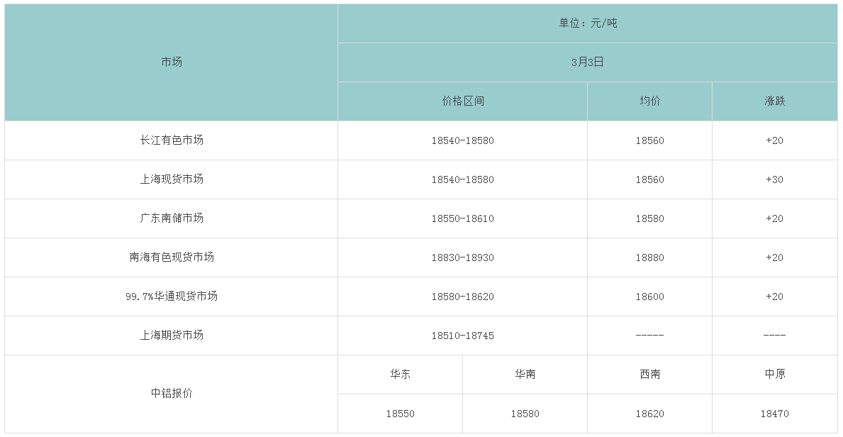 3月3日各大市场铝锭价格表