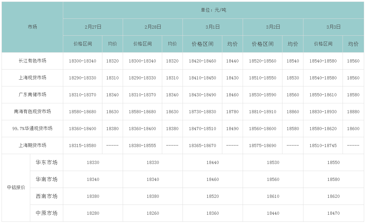 2月27日~3月3日各大市场近五个交易日铝锭价格表
